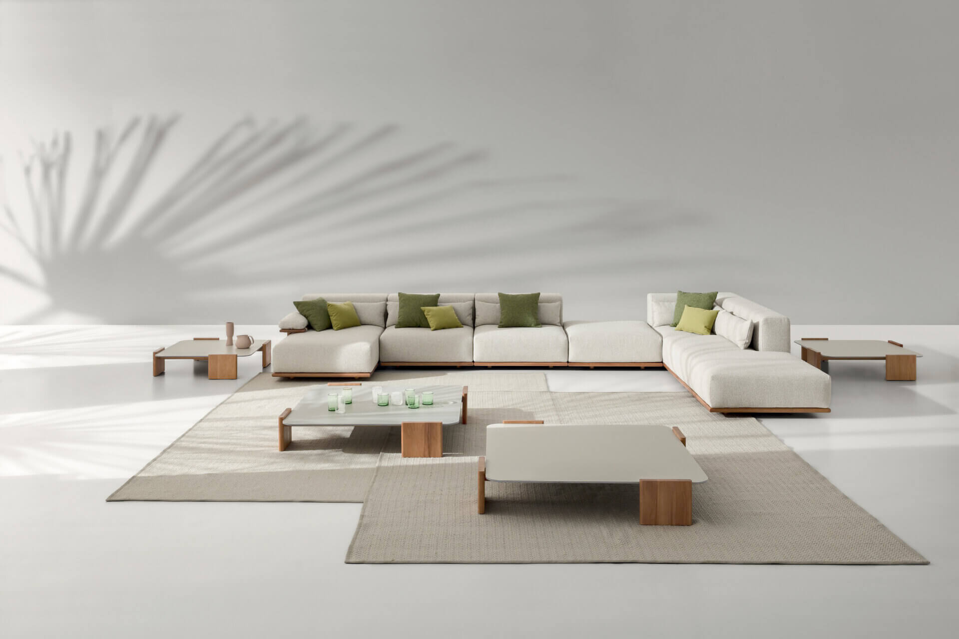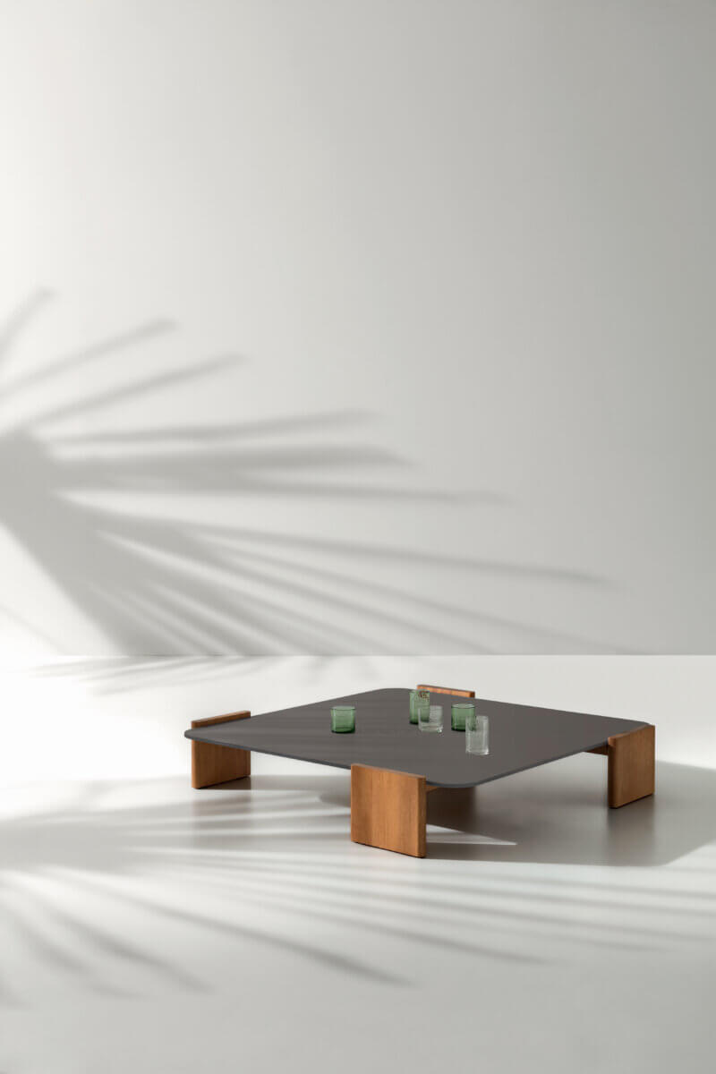 Like the Tao sofa, the matching coffee table also uses Iroko wood as its formal and material base. Designed by Ramón Esteve Studio, it has a solid and natural appearance, perfect for blending into the landscape.
